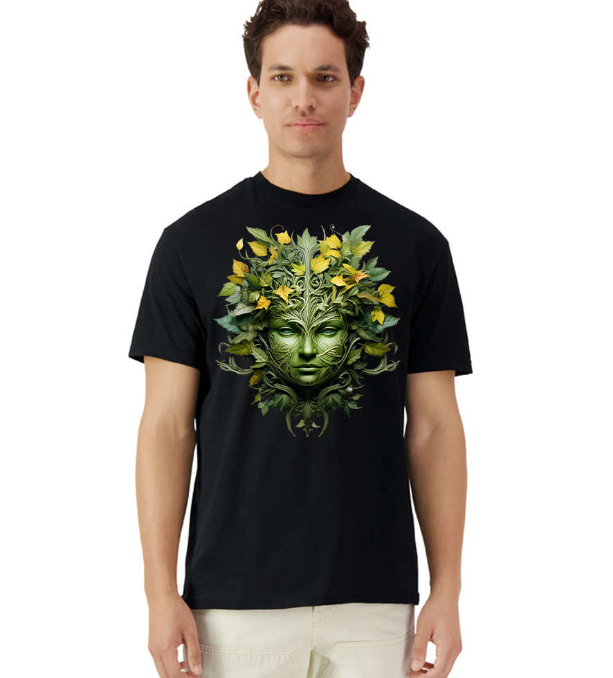One of our many beautifully coloured Green Man images . Available on Unisex T-Shirt, Lady fit T-shirt ,Long sleeve Unisex T-shirt and hooded Top - All garments are printed front and back , T-shirts large front , small back of neck ( unless its a special ) and hoodie is smaller front and large back